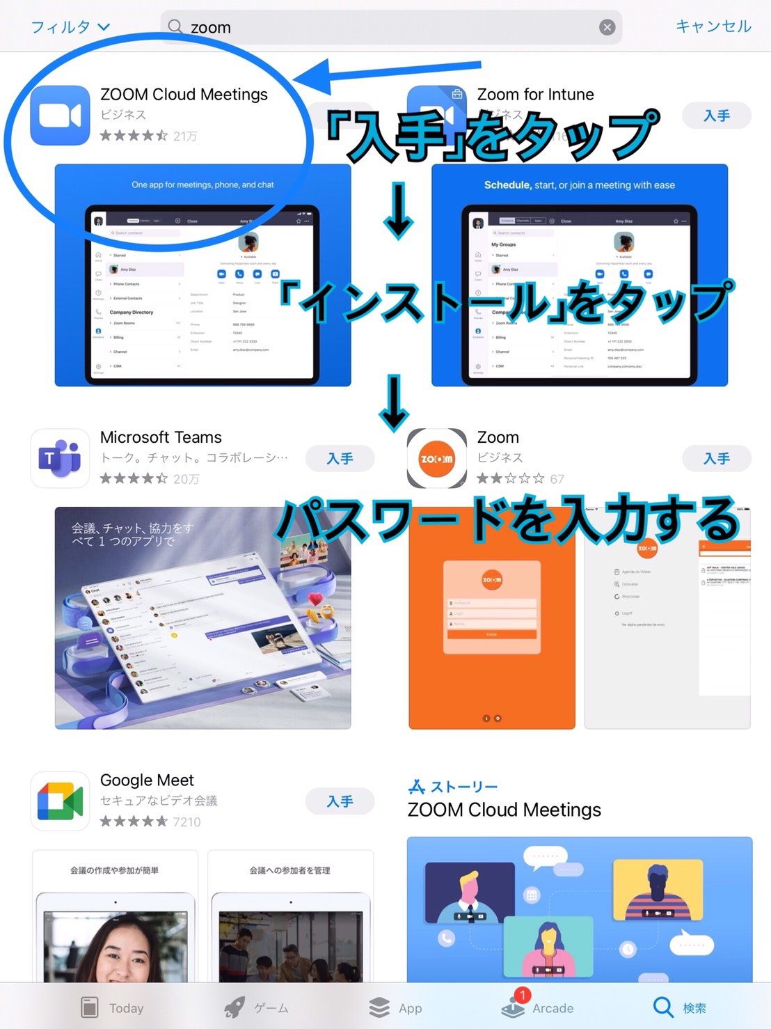 ③「zoom」と入力して検索