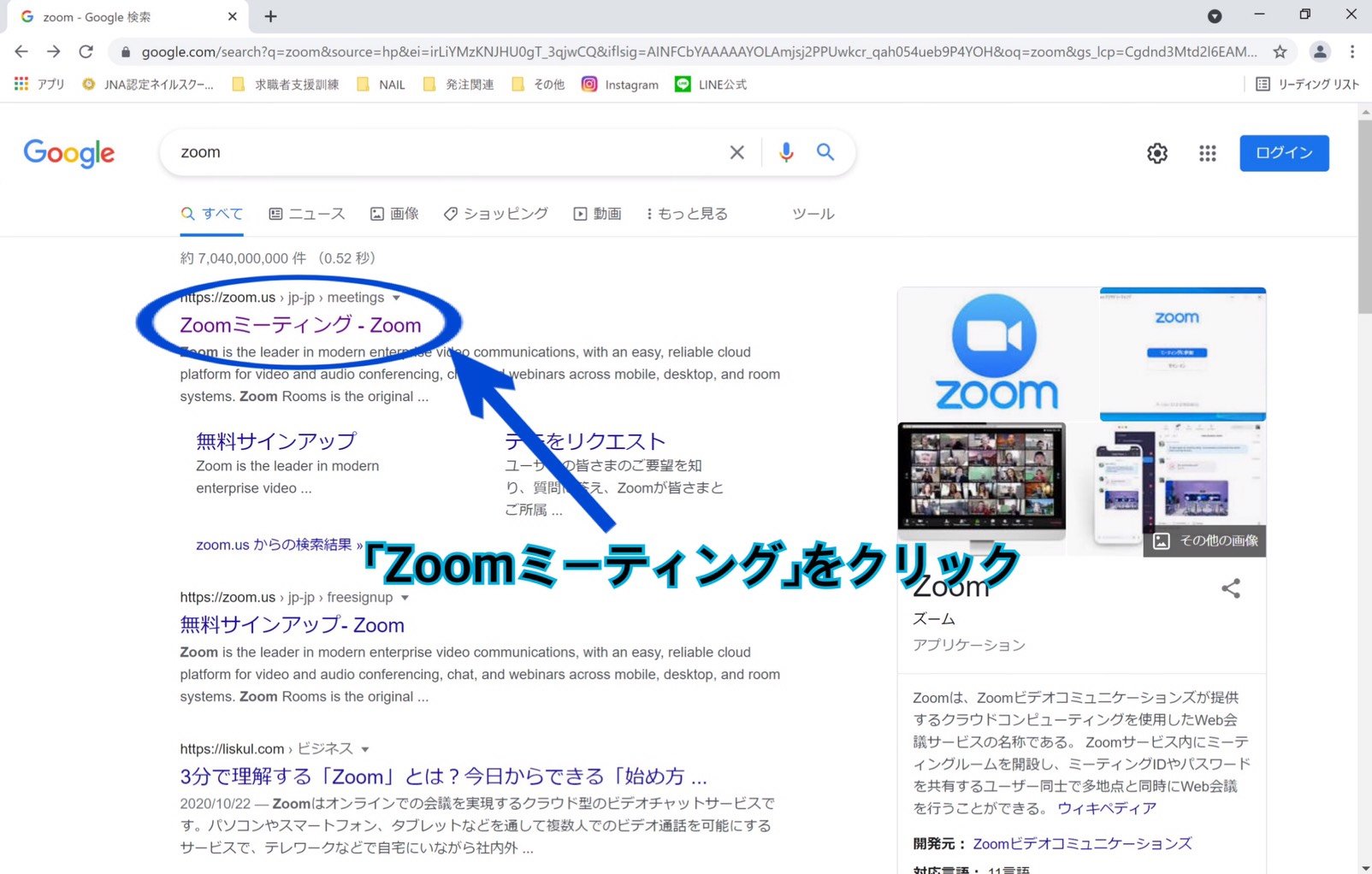 ①検索サイトより「zoom」と入力して検索