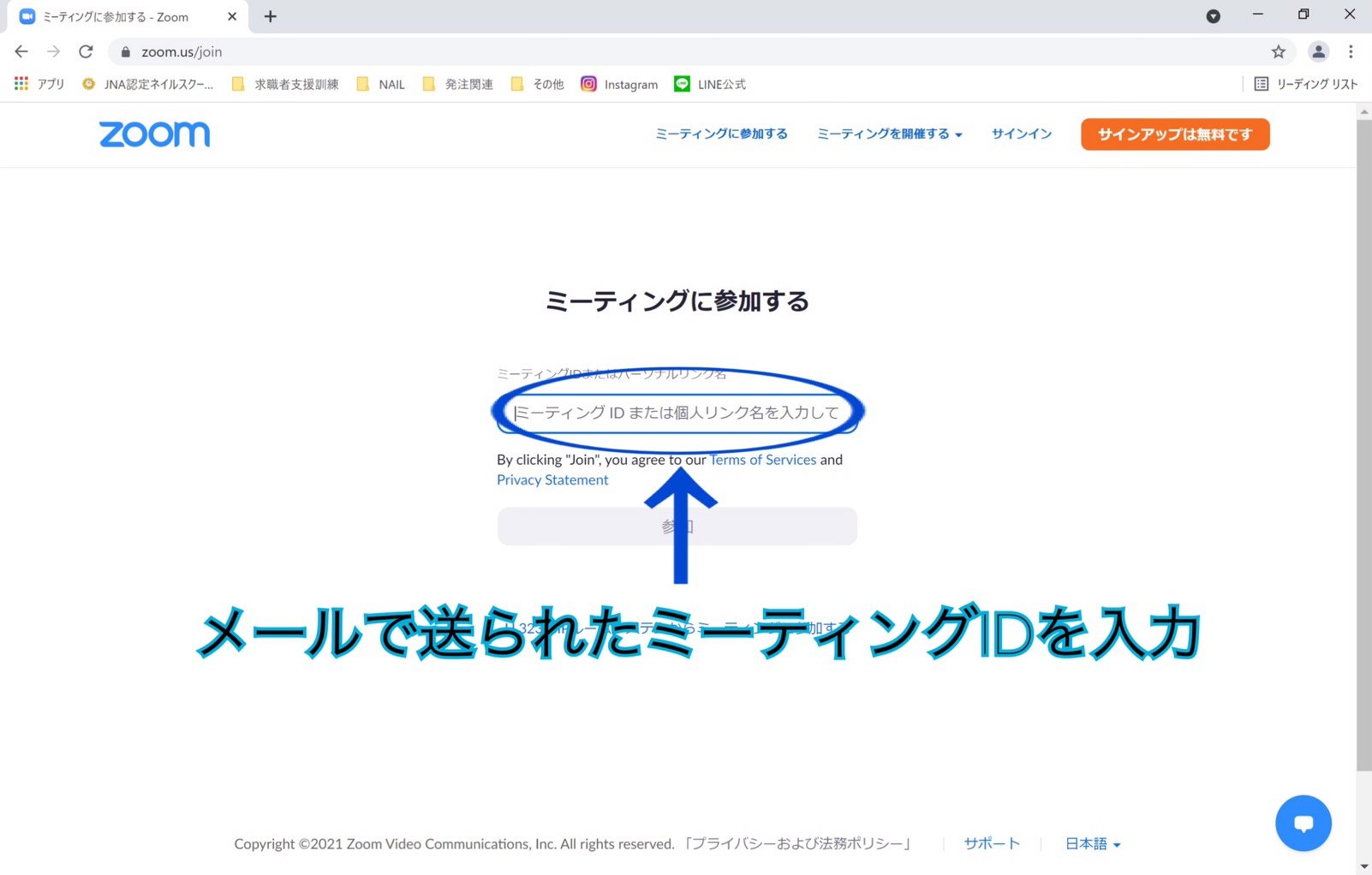 ⑦メールで送られたミーティングIDを入力